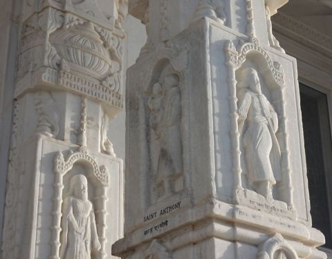 这个庙宇比较新,白得刺眼,没什么历史可言,感悟沧桑感。 进去也是要拖鞋的。 大厅里可以拍照,印象最深的是,一边有人不停地在拖地,一边头顶上鸽子盘旋,不断有鸟屎滴下来。 站在下面,我真的很怕啊! 这座庙最有趣的是外面的雕像,你可以看到圣彼得,看到孔子等,各路大神都来此汇聚。 绝对是新潮印度教寺庙。