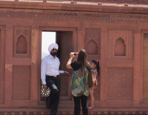 很多游客在此参观拍照。红堡的贾汉吉尔宫是座精美的红色宫殿,有着精致建筑风格和雕刻