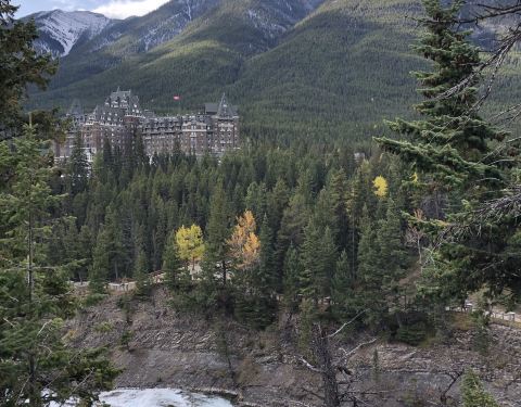惊奇角、惊奇角,有些惊奇但是也没有那么惊奇,其实就是一个小山坡拐角处的眺望台,是个眺望城堡酒店的好地方,山脚下就是弓河瀑布,不过下不去。