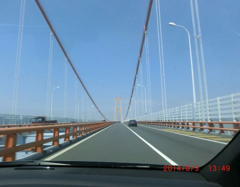 早上7点出发,绕城高速西段车流不拥挤,但过了蛟川枢纽后车辆就多起来了,好在并无拥堵。跨海大桥上倒不堵,边开边惊叹,可惜无法停车拍照,家人也不要拍。只在回来时拍了几张。舟山跨海大桥由金塘、西堠门、桃夭门、响礁门、岑港五座大桥组成,连接镇海、金塘岛、册子岛、富翅岛、里钓岛和舟山岛,全长48公里。其实舟山和宁波本属一家,原先去舟山需到北仑白峰码头经汽渡过去(小车汽渡费用为80元,略低于大桥通行费100元),大桥开通后,宁波镇海这边基本上都走大桥了,只有北仑地区的车辆可能还是走汽渡。国庆期间大桥免费通行,汽渡也许就没有小车去问津了。
