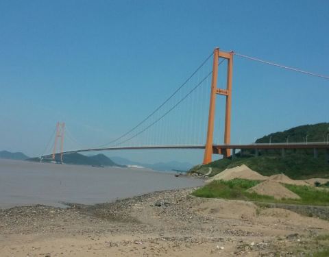 西堠门大桥是舟山跨海大桥中的一座,2009年底通车,橙黄色的色彩特别明快亮丽