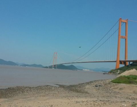 从陆地前往舟山岛的必经桥梁,建造的很宏伟,黄色桥身,双塔斜拉索,远看有点美国旧金山金门大桥的感觉。
