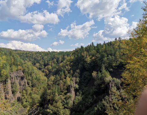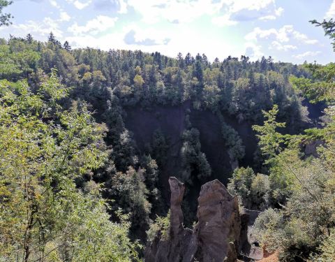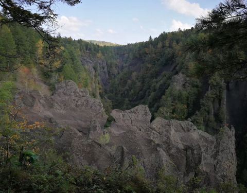 这里是国内规模最大的火山岩区峡谷地貌,峡谷幽深,望不到底,听见水声轰隆,偶见溪流奔涌从天池上下来,坐上景区摆渡车就到了锦江大峡谷