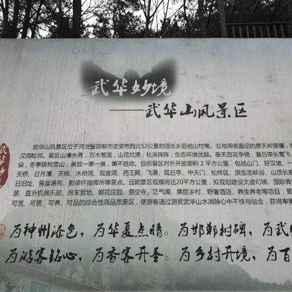 ...2公里处,前后柏山接壤的山坳里,这里山清水秀,万木葱茏,山花烂漫,松涛阵阵,进山门首先映入眼帘武华山 东太行山武安市的小华山位于武安市西北52公里处,前后柏山接壤的山坳里,这里山清水秀,万木葱茏,山花烂漫,松涛阵阵,进山门首先映入眼帘 2016-12-30 14:31
