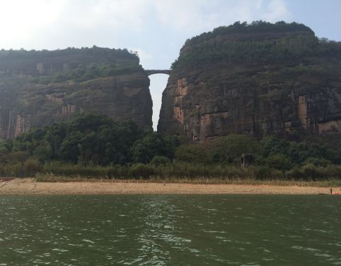 龙虎山风景区里面坐竹筏是门票包含在里面的,竹筏的船老大会给我们讲着旁边的美景的故事,这座仙人城就在最上面的山峰有一座石桥连接着,所以叫仙人城!