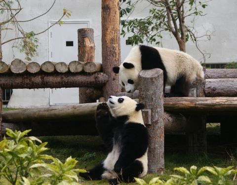 在卧龙大熊猫基地,可以先乘坐观览车前往成体馆自上而下地游览,也可以按顺序步行依次前往到卧龙,来与大熊猫共度