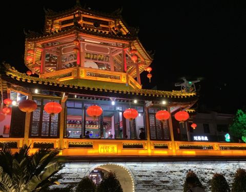 “樵楼晓角”又作“谯楼晓角”,是指位于揭阳榕城区的进贤门,城门始建于明朝天启元年(公元1621年),历史悠久,更是有着浓厚的传奇色彩。 进贤门城楼分三层,下层为瓮城门,中层为城楼,上层为琉璃亭阁,四面配以朱漆画栏,壮丽堂皇,夜晚在景观灯的照耀下更是璀璨夺目。 进贤门所处位置为揭阳市中心,当地人亲切地称其为“红亭”,对于他们来说,这是到达市中心的标志,也是外来游客必访之地。 进贤门还有着波折的发展历史,相传在唐宋时期,这一片出过7个有名的贤士,他们认为这个地方适合建造城门,便刻了一块写有“进贤门”的石匾埋在地下,到了明朝时期,这里又出了7名贤士,他们选定在这个地方修建一座城门,结果挖出了当年的那块石匾,从此便有了这座非一般的“进贤门”。