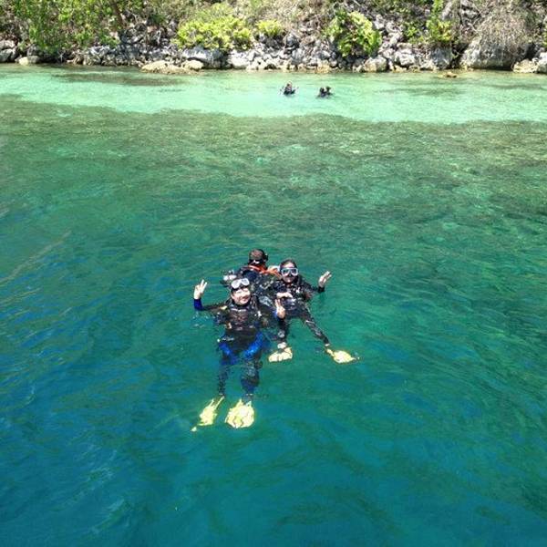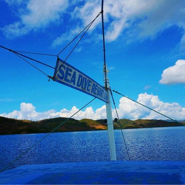 今天的主要项目就是LUSONG GUNBOAT-----沉船探秘。 船家包餐,潜水2500P/人,不潜水的就是550P/人 距离科隆镇一个小时左右的路程 今天8点钟就到了sea dive集合,然后就给我们播放潜水教学片,居然还有中文字幕,学习了大概有半个多小时的样子,让从未潜水过的人会有一个基础大概的了解。 一路上仍然是风光无限好!抵达潜水的地方,风景很美今天的潜水教练有个帅哥,名叫Vicent,笑起来很迷人,还有点小害羞,还担当我们的大厨,顿时化身为小迷妹。下水后,教练会带我们熟悉下周围环境,然后在海里教大家换气,耳压平衡、面镜进水等基本潜水操作,大约有20分钟的样子,这点很值得夸奖,比我们前几次的深潜都专业很多!今天的沉船探秘说实话有点失望,不知道是不是因为今天海水不够清,还是我们的这个潜点一般,没有以前看别人攻略里面的漂亮。舰体上长满了珊瑚,有些鱼,没想象中好看。感觉下潜不是很深,因为比我薄荷岛那次的好太多,那次耳压超级难受,很痛,这次没有太大反应,下潜深度显示11米。潜水回来,Vicent开始给我们准备午餐,做饭的男人很性感,有木有?