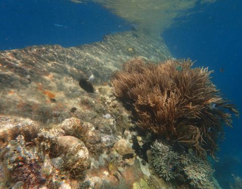 适合浮潜的著名沉船点,船身离水面实在很近,有很多的珊瑚和鱼。
