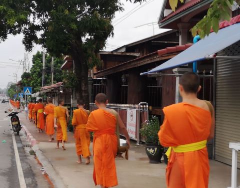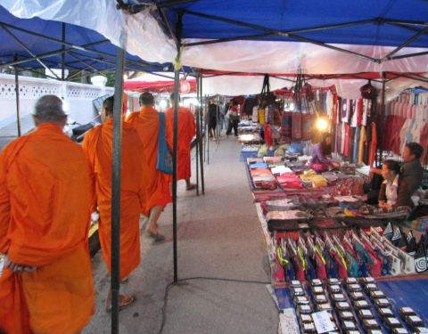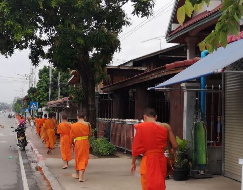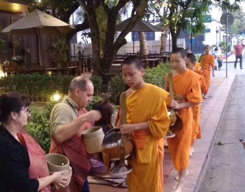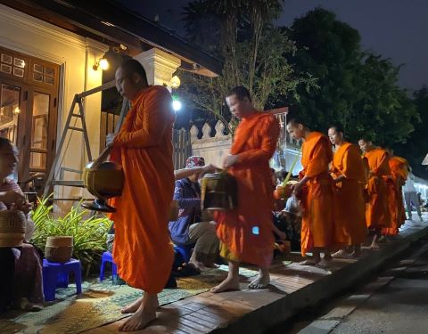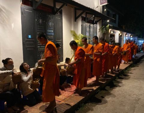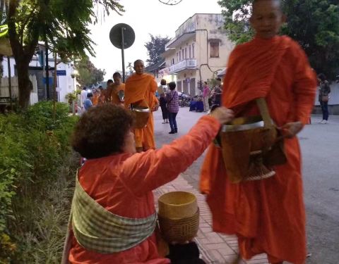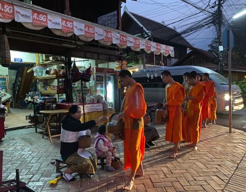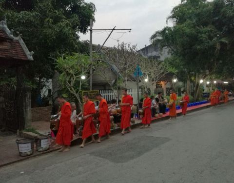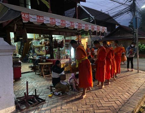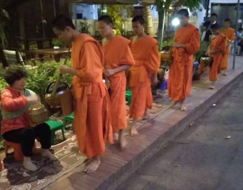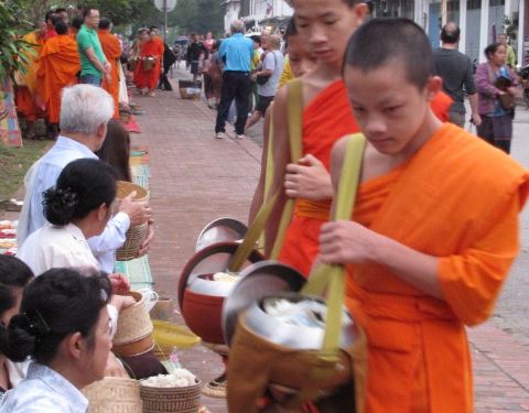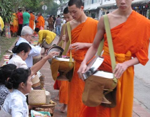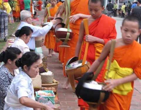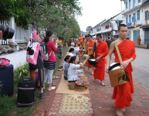 清晨的布施是来琅勃拉邦的游客一定要体验的一个当地的风俗。明天天蒙蒙亮就有信徒在洋人街附近把饭投入和尚的碗拨之中。这一传统已经流传了千年