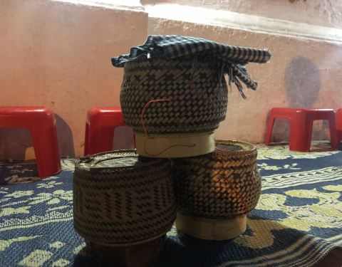 感觉有点变味,全部是游客,没有当地人,绝大部分是团队,坐好事先定好的小板凳上,及配套的装在竹览里的糯米饭,共20000基普,约16元人民币,5:50左右开始,约6:15给束。
