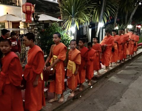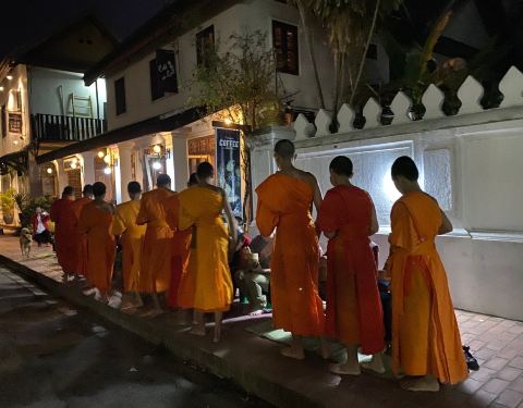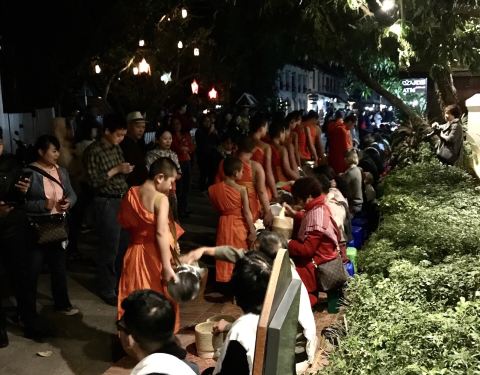 到了琅勃拉邦观摩清晨布施活动是必然的,也是最吸引游客体验的活动之一,整个活动大约维持一个小时。凌晨5:30,天还是黑的,走入洋人街已经非常热闹,有买卖布施食品的、有占位置实施布施活动的、有忙于观礼拍照...