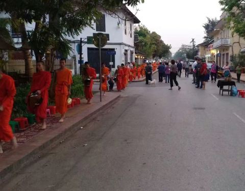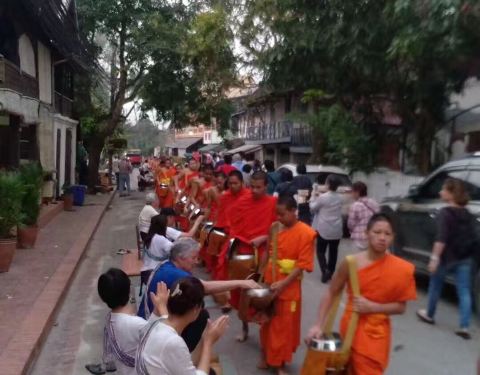 我们住在琅勃拉邦的一条与主干线平行的一条街上,旁边就是一所庙宇,清晨,天还是蒙蒙亮,大鼓就被敲的震天响,刚刚到也不明白,突然街上的人骚动起来,眼看着非常多的游客从宾馆里鱼贯而出,像一条街涌去。