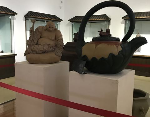 中国宜兴紫砂博物馆位于上塘老街,于2002年5月对外迎宾,集陶都宜兴紫砂精品于古镇锦溪,让往来游客饱览古往今来从粗犷到细致、从抽象到写实、从夸张到仿真的紫砂艺术文化。 紫砂造像“未来世佛”弥勒佛,特别是那巨型“东坡提梁壶”,以夸张的手法仿制北宋文学家苏东坡点炉煮茶的那把提梁壶。此壶粗砂手制,彩描手绘,从制作、干燥直至煅烧成品,历时200多天,净重1.5吨,可供2000人同时饮用。 在展厅中,陈列着历代紫砂名壶,有紫砂壶雏形——宋代紫砂壶,有明代时大彬提梁壶、陈子畦的圆灯壶,有清代邵大亨的掇球壶以及蜚声海内外的“曼生十八式壶”,还有彩陶、均陶堆花和紫砂瓶等现代紫砂艺术创作精品,其中不乏近年来在国内、国际上获大奖的作品。馆内展出的大彬提梁壶,与故宫博物院的大彬款紫砂胎包漆方壶、扬州博物馆的时大彬六方紫砂壶同为国之重器。明代紫砂巨匠陈子畦的圆灯壶,是明代初年“像生壶”的佳作。 “曼生十八式”,是由清西泠八家之一的陈鸿寿(号曼生)铭文,号称“一门眷属”的紫砂艺术人杨彭年制作,乃紫砂界的传世瑰宝。