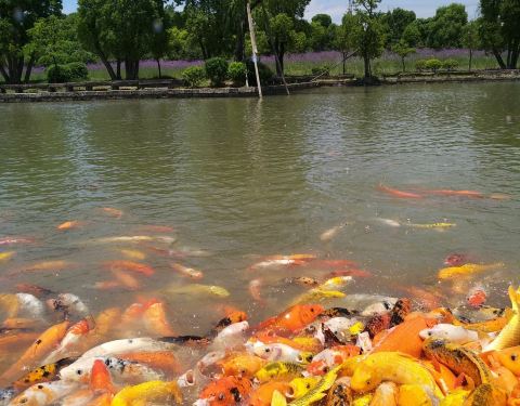 上海闻道园,位于宝山罗店镇,开放面积约30万平方米。是上海最大的私家园林,但不是江南园林,没有亭台楼阁小桥流水。应该说是一个以徽派古建筑为特色,展示传统徽派建筑营造手法、艺术特点的,与郊野风光、湿地景观相结合的私家文物园林。 长风书院里面是传统布置,前面是锦鲤池,可喂鱼。鱼群争抢鱼食,很是壮观。后面是徽州古戏台,装饰以徽派三雕:木雕、石雕、砖雕,精美绝伦。周边有大面积的马鞭草,紫色一片非常漂亮。是园内景色最好的区域。
