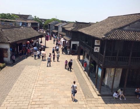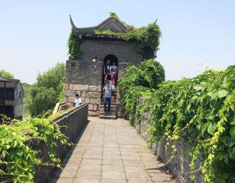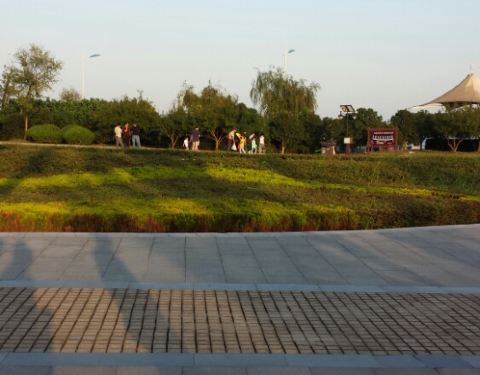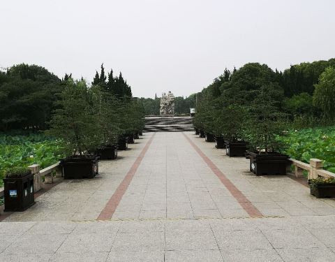 这个广场就在沙家浜门票收费入口前面,广场的核心是一个雕像,上面有沙家浜的四个人物形象,前后各两个,广场通道有18根造型各异的石柱,是沙家浜18位伤员的象征。