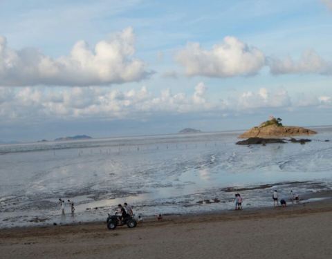 【位置】开车过来,先经过一条乡间小道,刚好够一辆大巴开过,路边全是菜摊。来到景区门口,要说明是住度假村的,才会放行。 【环境】景色真的很一般。下午退潮的时候,海水离得很远。滩涂上偶有游客下去捡贝壳。沙滩沙砾挺大的,黄黄的,被潮水冲上岸的海草让海滩看上去有点脏。 【设施】岸边一排烧烤房,雨天有帐篷,比较有意思。度假村的客房设施齐全,有一次性牙膏牙刷梳子浴帽,洗发水沐浴露纸巾吹风机热水壶空调,不过就是蚊虫有点多。淋浴间的地上难免有些沙子。 随便度个周末就这样吧。