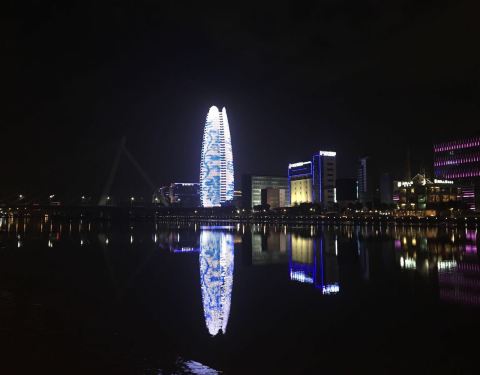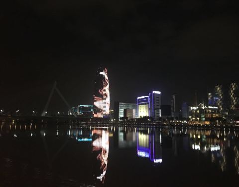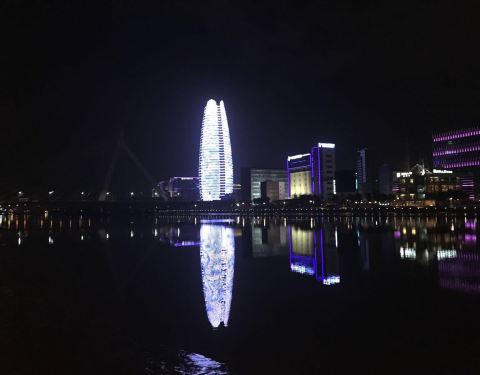 一到夜里变幻出美丽的色彩,和后面的建筑交相辉映,完美