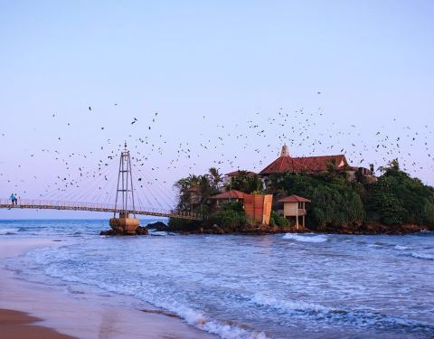 斯里兰卡南部最著名的海滩之一,金色的沙滩,婆娑的椰林,奔涌的海量构成了这里的美景。面朝大海左手边有一处观景石,每逢傍晚,很多人聚集于此观赏日落