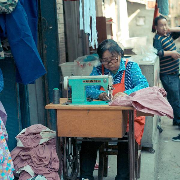 不知道是不是天生对老街的偏爱,每到一个新的城市,我总想着能找寻一些老旧的记忆,所以只要看到稍微复古些或者说是破旧些的建筑,我就会把脚步放慢——得胜桥一带就是我在闲逛时偶然间发现的。这里看起来似乎没有什么特别的景观,但是错乱的电线杆、旧书店、晒在街上的衣服……这些都足以让我驻足停留。走在这些小街小巷中,时光仿佛回到无忧无虑的小时候,看到邻家的爷爷奶奶会热情地打招呼……路边的小店,表面上好像是在做生意,但却特别悠闲,老板和客人就像朋友一般。这家卖猪肉的可以说是最接地气的了,已经有很多年没有见过这样的店铺了。手艺人踩着缝纫机这里的人们和街道仿佛就与外面热闹繁华的世界隔绝了,在小巷子里诉说着上个世纪的故事。