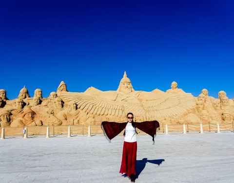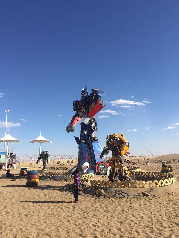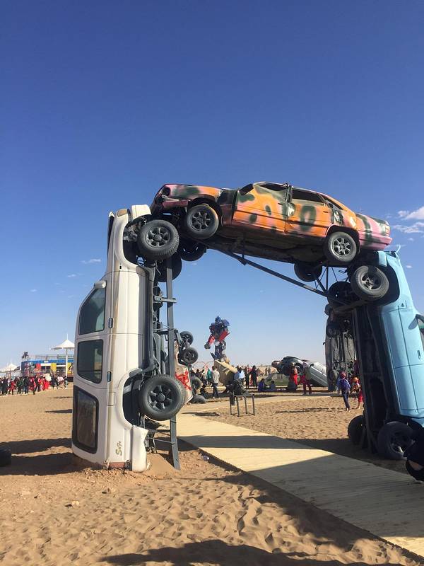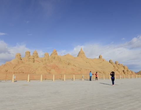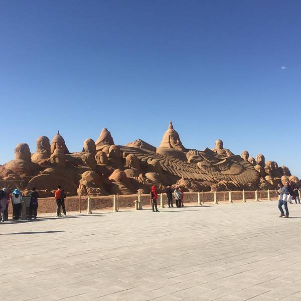 七道桥以东就是沙漠的边缘巴丹吉林沙漠,所以八道桥完全是沙漠风情,很有特点,千万不要错过。 快到八道桥的时候,隔着河能看到远处的沙丘,路边没有树了。不过一直看黄叶,就算大脑还很兴奋,视神经也会疲劳的,可能兴奋响应阈值会很快升高,立马就审美疲劳了。所以来点不一样风情的调剂下也好。 到了八道桥,一下车就看到了“沙雕”,真的是“沙雕”,好多“沙雕”! 来都来了,沙漠活动最好玩的是什么? 第一骑骆驼,第二滑沙,越野车要自己开可以排第三。土豪请全包。 于是我和同团大佬一行组了个驼队。别人都骑棕毛骆驼,我弄了只白骆驼,而且这只还很温顺! 驼队只是在沙丘锋线上走一圈,这样走是最省力的。绕了三个峰,一圈下来有10到15分钟。 中途你可以要求牵缰绳的工作人员帮你拍照,他们会停下来满足你的要求。由于拍照经验丰富,他们的构图还不错。 温顺的骆驼骑着还是很舒服的,站起的时候后脚先起,前脚再跟着起,跪下的时候相反。所以在起飞和降落的时候人要后仰,再绷紧脚蹬,可以把人牢牢的固定在鞍上。 另个一个比较刺激的项目就是坐越野车冲沙了,不过只能坐副驾 沙漠风情园其实也就这么大,喜欢沙漠的盆友可以多待一会儿。不过额济纳的重头戏一直是胡杨林,别让沙漠喧宾夺主。 P.S. 也有很多人希望能拍到沙丘落日的景象,事实上就算是大中午,在沙漠的背坡也是很冷的,越迟阴影越大,影子也拉的越长。下午4点多天气就很糟糕了,还可能起沙城暴。 另外骑着骆驼在锋线上行走时也会时不时遇到沙暴的骚扰,请做好防护。