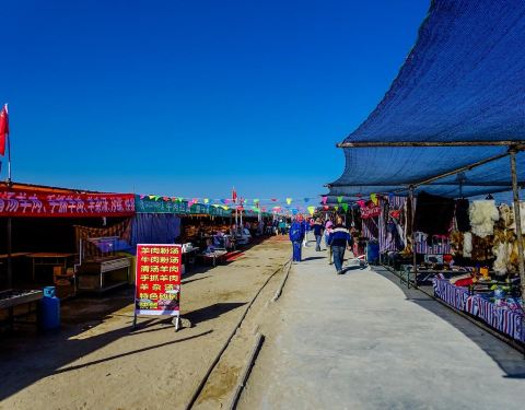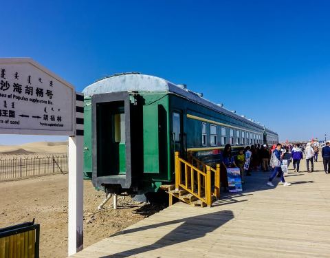 ...可以在这里解决一下,价格当然不会便宜了,不过没办法,景区里的价格基本统一,一串羊肉串最少10元从七道桥出来后,等了一会观光车就到了,先到八道桥看看。其实额济纳胡杨林的八道桥并不是胡杨林,而是巴班吉林沙漠风光,但套票也是包含的,所以还是来看一下吧。 到了八道桥,起码有很大一片吃饭的地方,肚子还...从七道桥出来后,等了一会观光车就到了,先到八道桥看看。其实额济纳胡杨林的八道桥并不是胡杨林,而是巴班吉林沙漠风光,但套票也是包含的,所以还是来看一下吧。 到了八道桥,起码有很大一片吃饭的地方,肚子还饿的话,可以在这里解决一下,价格当然不会便宜了,不过没办法,景区里的价格基本统一,一串羊肉串最少10元。 八道桥的景区面积虽然挺大的,因为全是沙漠,你要用走的话,估计走不了多远,所以景区里安排有骑骆驼和坐越野车的项目,骑骆驼是150元一个人,越野车260元一人,800元包车,号称可以开30公里进到沙漠里,那里有条额济纳河,也有胡杨树。不过个人觉得这个价格我是不能接受的,反正一会还有好几道桥要看胡杨林,这就算了。 另外,走远路的都喜欢租个鞋套,不过象我这样只走一小段的,可能光脚更好一些,天气不是很热的话,光脚很舒服,太热的话沙子会烫伤脚。 在八道桥入口处的这趟列车也是专门拉过来做装饰用的。 展开