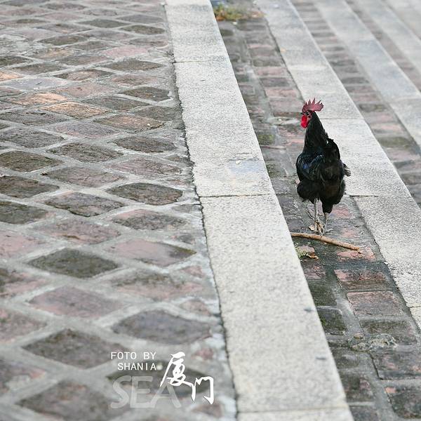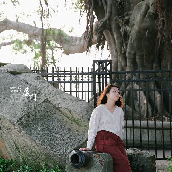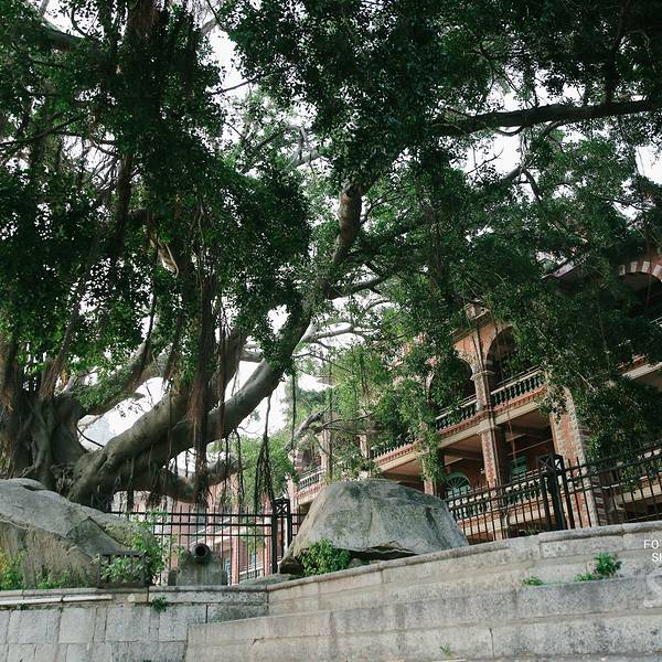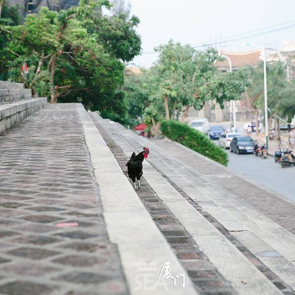 继续去嘉庚公园的路上路过高中部一个大台阶,这边也很适合拍照,刚好在课间,一群高中生在外头坐在台阶上玩着手机。想起来我们高一那会iphone才刚出3GS,而且学校也严格得不允许携带任何数码设备,现在的小孩真幸福。待上课铃打响后我们走上台阶,没想到他们教室门口居然还有一个小炮台,背后是一个巨大的榕树,果然随处是风景啊。走的时候看到不远处居然有一只公鸡在台阶上散步,也是很有趣。