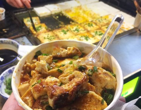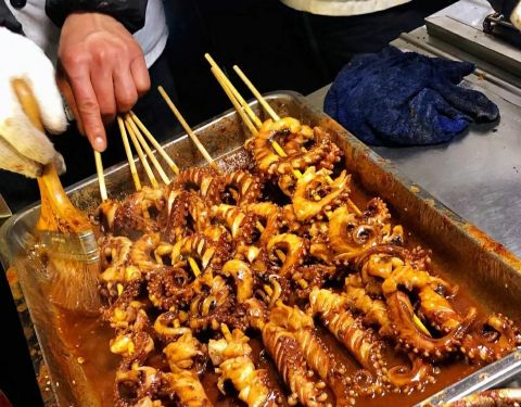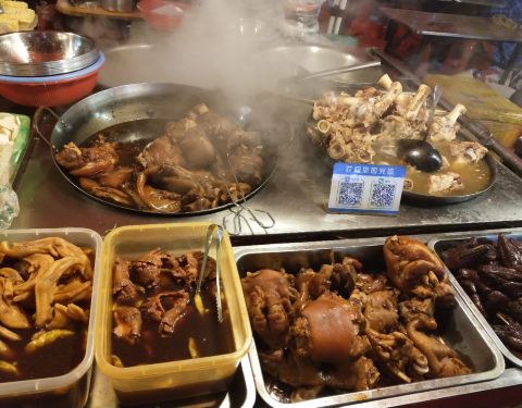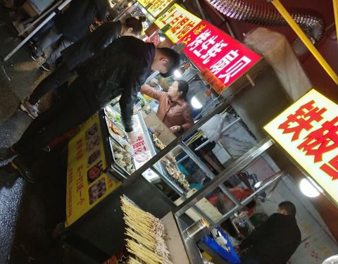 人超级多,卖什么的都有,下着雨那么冷,吃的东西好多好多