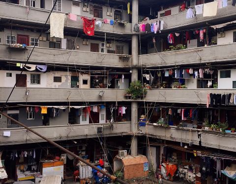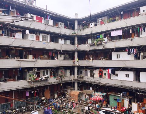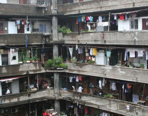 现在住在那里的多是老人,整体氛围和福建土楼好像以前的职工宿舍楼,矩形环状,因为周星驰《功夫》一片里有相似布景而火了。现在住在那里的多是老人,整体氛围和福建土楼好像。