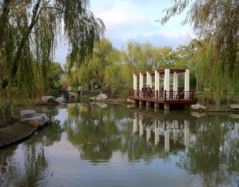 公园是免费的,但景色并不差,小桥流水,亭台楼榭,公园里四季有花,有樱花、梅花、有荷花睡莲……,有柳树依依,有芦苇飘飘,这里没有健身大妈和歌唱队,有的只是孩子们玩的活动场所,非常惬意的一个小公园