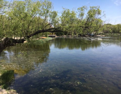 在市中心,面积虽然不是很大,沿着河边走一圈,也是要半个多小时到一个小时的。河边有很多柳树。