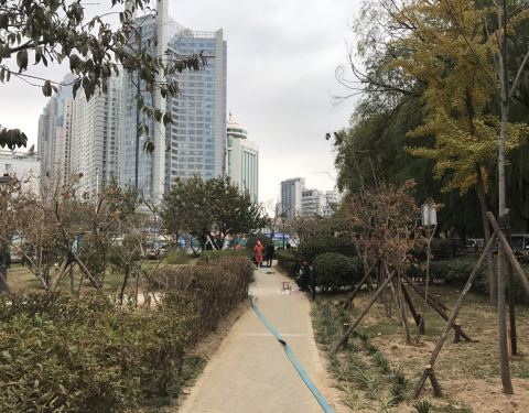 在井冈山路,香江路,紫荆山路这一带,基本上没有其他公园和娱乐的地方,这个公园正好给人们提供了一个非常好的娱乐,歇息,聊天的地方。公园跟公路之间有一条不错的小河,正好给单一的平地增添了活力和生气。公园里有文化长廊,也有小亭子,还有晨运的地方,等等。平时,公园里挺热闹,有摆地摊卖小东西的,剪头发的,算命的,还有成群的叔叔阿姨,爷爷奶奶在哪里跳舞。