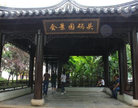 入口处不远就走到了会景园,这里有绿茵广场,还有会景园码头。从码头可乘渡轮去湖心岛,壕股塔等景点。会景园里绿荫葱葱,植被茂盛,更有各种应季花盛开着。特别是在烟雨蒙蒙的时候来这里漫步,更能体会烟雨江南的感觉。