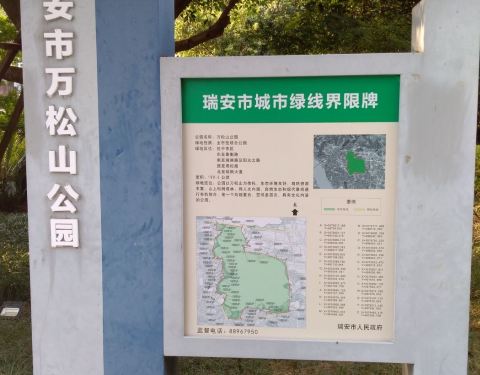 万松山公园位于瑞安城区以北,总占地面积 216公顷,最高峰海拔208.7米,是瑞安市民 休闲锻炼的好去处。在车辆日益膨胀,绿地 日益减少的瑞城,这里是瑞安美丽清新的绿 肺,也是瑞安老城底蕴深厚又最充满活力与 生机的地方,除了给人健康,更给人快乐。 在这里登山,你时常能看到游山的学生、身 着迷人的草绿装锻炼的战士,精神瞿钰的老 者、朝气蓬勃的年轻人、更有忙中偷闲的中 年人。