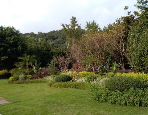 ...树木,最有特色的是一棵棵的棕榈树,公园里还有一条石子路,走在上面十分的舒服十字路旁有鲜嫩的草地