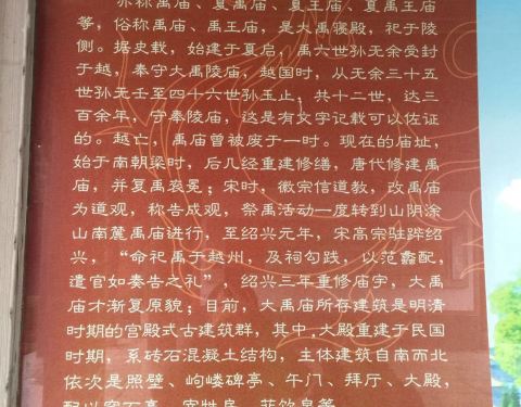 大禹庙是祭祀大禹的主要地方,由一组宫殿式建筑群组成,又是一个大手笔,始建于南朝梁武帝时期,但是屡建屡毁,现在的建筑主要是清朝重建,除了大殿是民国22年(1933年)重建!