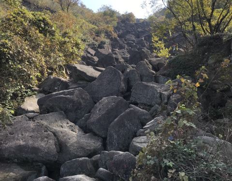 覆卮山的石浪。 哪里吹来的一阵风,掀起了这样一层浪。 覆卮山,地处上虞、嵊州、余姚三市(区)交界地带的上虞区岭南乡,主峰海拔861.3米,是上虞区最高峰。 因为天气热,我们直接坐车坐到了山顶,车子行驶在盘山公路上,陪伴我们的是山边的溪流和梯田。 在山顶,我们穿过掩映在竹林里的一处村落,来到了石浪的顶端。几百万年前的冰川遗迹,造就了覆卮山上的千层石浪,这是大自然给予世人的奇迹。听说每年都有人不甘于只是看看,而要攀石。而从高处看这石浪,脑海中浮现的,是几百万年前火山喷发时,这些石块随着火焰喷发而出的壮观场景。 我们先在是站在高处向下眺望,就已经觉得有些眩晕了。据说周边一直有旅游组织带领团队从顺着这片石浪,从山底攀爬到山顶,想想就有些惊心动魄,但也很想尝试一下这样的刺激,希望下次能来爬爬石浪。