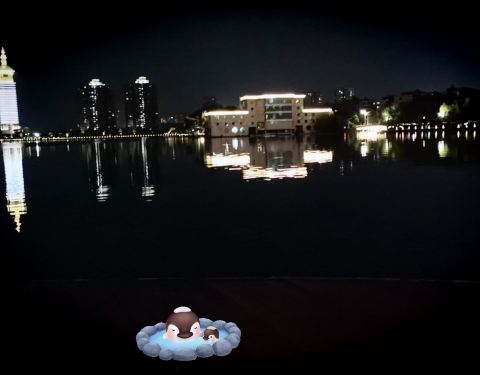 湖中有大黄鸭 晚上有喷泉 灯光也很美 还可以坐船游览青山湖风光