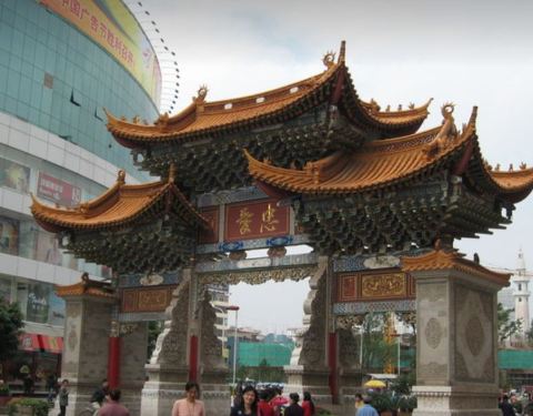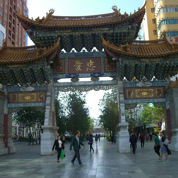 和金马碧鸡牌坊的并列有所不同,这里更像是通过南北向的步行街与其形成三角形构造的感觉,步行街上的这个牌坊放更容易被忽视,但周边包括昆明百货以及麦当劳等餐厅还是让这的人气不减。夜晚蓝色的灯光在这里与黄色灯光为主的两牌坊形成鲜明对比