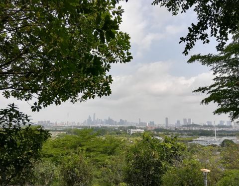 从大学城经官洲隧道进入生物岛,最近的景点都是揽胜园。相对于其它景点,揽胜园游客最少,可能是一不近绿道,二不近地铁站的缘故。但揽胜园也有揽胜园的优势,无论绿化、或是亭廊,都能看出是精心布局之作,尽显岭南园林之美。在揽胜园山顶上俯瞰,可以很清晰地看到一江之隔的大学城。