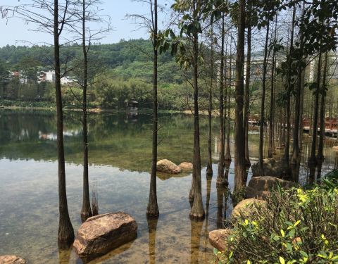 环境优美,景色宜人。花草树木繁茂,四季花品不同。樱花、黄槐、鸡蛋花、凤凰木、水石榕、羊蹄甲……姹紫嫣红。鸟语叽啾,林间穿越。空气清新,湖水清澈。漫步其中,心旷神怡。