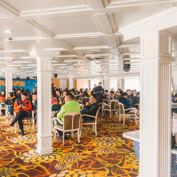 到点排队上游轮,其实游轮不算特别大,不过出了海还算平稳。可惜天气不大好,有阴天湾仔游船码头还是第一次过来,参加了一个游船远观港珠澳大桥的游船活动。到点排队上游轮,其实游轮不算特别大,不过出了海还算平稳。我的票可以上2楼游船厅,3层是观景平台。可惜天气不大好,有阴天。