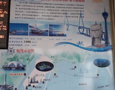 可以选择60分钟或者90分钟的游船,欣赏澳门美丽的夜景,珠港澳大桥,澳门塔,大三巴,葡京酒店等珠海湾仔旅游码头就在著名的湾仔海鲜街对面,是坐澳门环岛游船的地方。可以选择60分钟或者90分钟的游船,欣赏澳门美丽的夜景,珠港澳大桥,澳门塔,大三巴,葡京酒店等。