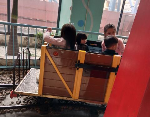 ...话走,就是有好多游戏不够高,小那两个在那里哭要进去玩,她们讲话最好玩是玩家庭过山车玩了好几次了