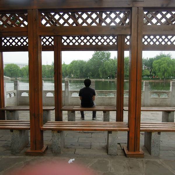 安静的坐在长椅上面,欣赏对面风光。早上7点27分,前往山海关莲花湖公园游览。湖面上出现大片荷叶