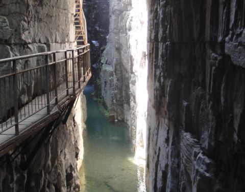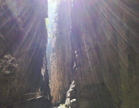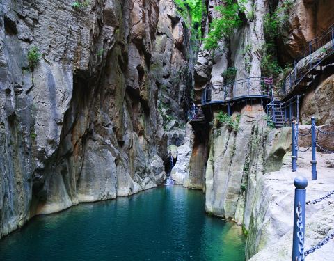 主要就是一条沟,走到尽头是一个水潭和一个挺大的瀑布。然后是一线天,两山之间的夹缝中,一道铁梯曲折向上,两边不断有瀑布垂下。走到顶可以沿着崖壁上的小路走回,经过好几处断崖,极为壮美。