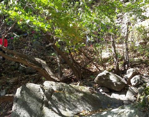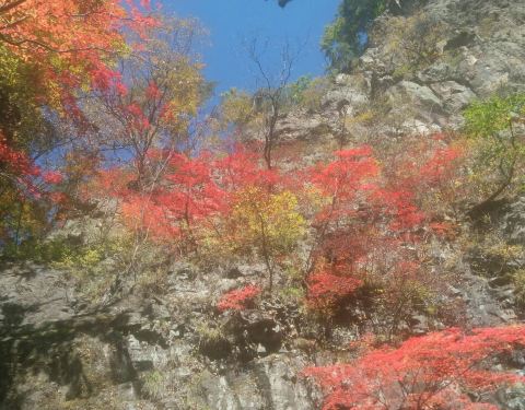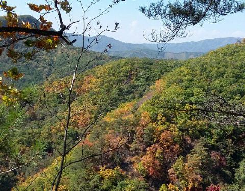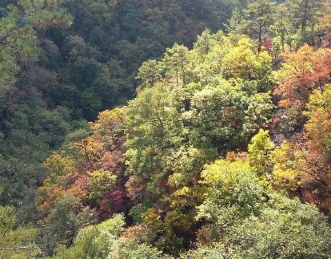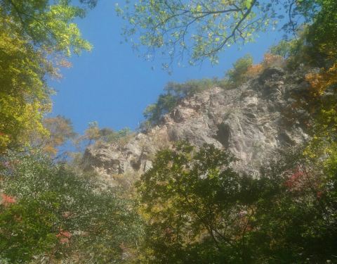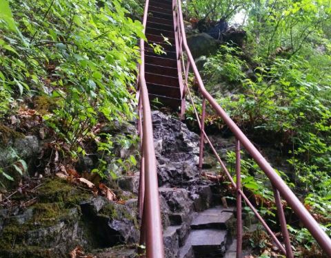 ...点陡的铁梯,需攀爬,胆小人不宜,顶上是一平台性质的树林,有枫林,不够红,下岩壁时,同样要往下爬