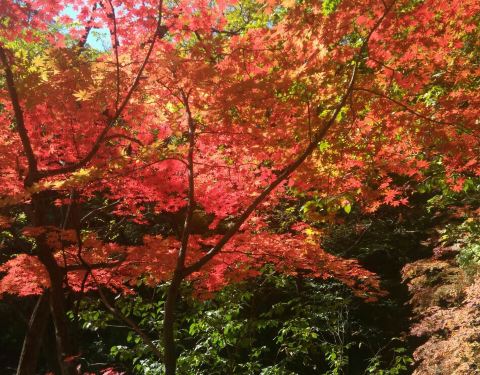 虎塘沟位于丹东宽甸满族自治县青山沟镇,是青山沟风景区的主要景点之一,其进门后一直是较缓的上坡,这段没东西,约1.5-2.0公里后有一面大岩壁叫九曲天水的地方,这里有几个红枫正是时候,随后是攀爬野猪岭,有点陡的铁梯,需攀爬,胆小人不宜,顶上是一平台性质的树林,有枫林,不够红,下岩壁时,同样要往下爬。刺激有趣味。