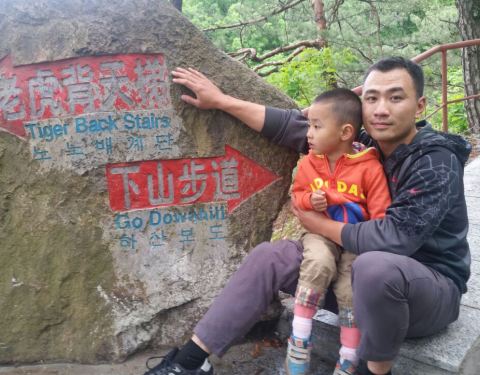 但这段石路非常好,我带着三岁的儿子顺利登顶,但到了小泰山后,一路抱下来的,臂力好的可以带孩子锻炼锻炼