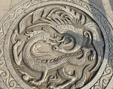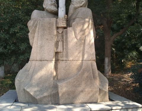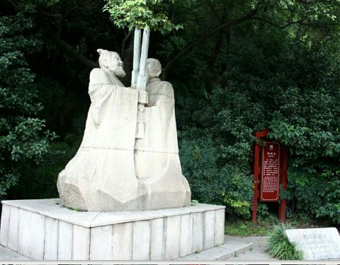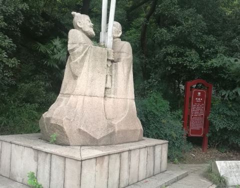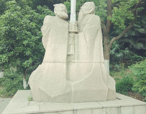 试剑石在北固山风景区入口处附近,要是不留意仔细看看,也许就会错过了这处景点,入口处牌坊东侧,有一组雕像,刻画的人物是刘备和孙权,两人各怀心机,用雕塑前的一组石块试剑,暗示江山归属……